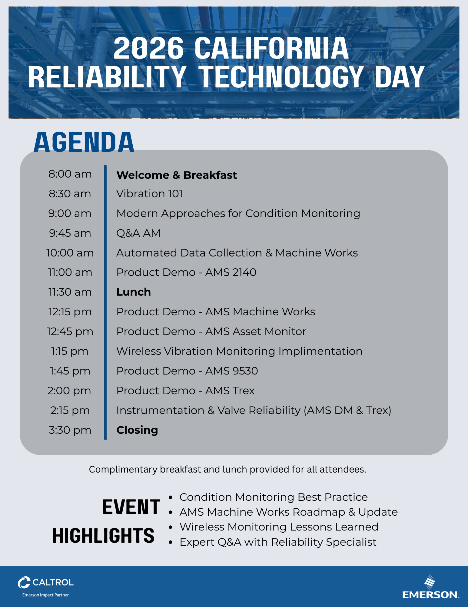 Join us for an interactive roadshow exploring how modern plants detect failures earlier and build predictive maintenance programs. The event will cover practical reliability strategies, lessons learned from real-world wireless vibration monitoring deployments, and the latest capabilities in AMS Machine Works. Attendees will see live technology demonstrations and have the opportunity to discuss real reliability challenges with experts from Emerson and Caltrol.