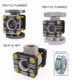 Dual-window sight flow indicators provide two glass discs on each side, so that if either glass should fail for any reason, the other window can withstand pressures temporarily until the unit can be repaired or replaced. Dual-window sight flow indicators and Factory Mutual System approved dual-window sight flow indicators are available in 150 pressure class NPT models and 150 and 300 pressure class flanged models.